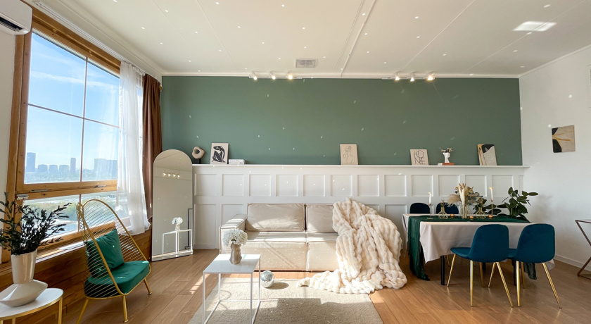 В зале мягкое кресло, диван-кушетка, бархатные ткани в молочного и изумрудном цвете. Панорамное окно, много дневного света.