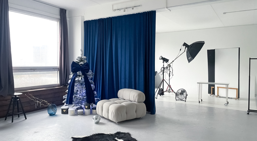 Зал SEREBRO - локация для коммерческих и рекламных съемок, индивидуальных фотосессий и записи видео. Импульсный свет Godox, циклорама, панорамные окна, интерьерная зона с мебелью.