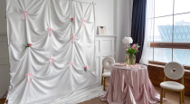 В зале «Уютный» : белый шелковый фон с драпировкой с розовыми бантиками и атласная розовая скатерть✨ В зале розовые тюльпаны !