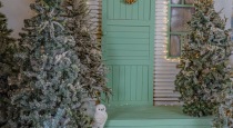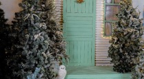 16. Домик с крыльцом лавочкой и велосипедом с мимозой и тюльпанами
