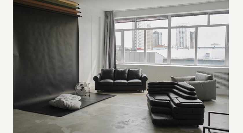В интерьере преобладает минимализм - ничего лишнего, чтобы внимание было сосредоточено на модели и эмоциях. В распоряжении фотографов: классический кожаный диван, модульный диван-лофт, серое кресло-пуф, деревянный стол, журнальный столик и несколько лаконичных стульев. Для съёмок доступны фоны в оттенках хаки, сливочного, коричневого и чёрного.
