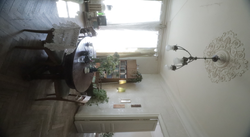 Свет здесь мягкий, приглушенный и таинственно-манящий. Фактуры стен, старинных окон и паркета создают харАктерную атмосферу, дополненную разнообразием утвари. Здесь сохранились старинная плита "Ленинград", умывальник с двойной раковиной, а над столом возвышается огромная картина современного художника Никиты Раевского.