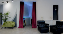 Оснащение: гримерный стол, шторы 100% блэкаут; 2 флага; , рейл для одежды, зеркало в полный рост, решетка, стол для фотографа, экран для проектора