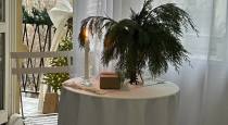 Камин, клавишные, мраморный стол, вазы, сервировка стола