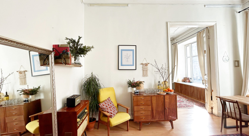Винтажная студия в стилистике Питерской квартиры с лепниной на потолке.