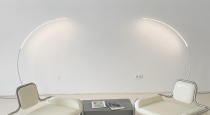 В зале есть две белых стены и стена из бежевых объемных квадратов . А также белые полы и огромное окно размером 5,6×2,8 м, которое хорошо освещает зал. На случай солнечной погоды в зале есть блэкаут шторы 60%.