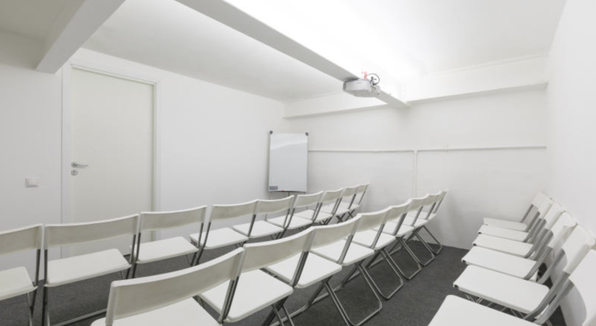 Проектор, 50 стульев, столы, флипчарты, планшеты, торшеры для локалького освещения столов. Передвижная стена может разделить помещение пополам (L1+L2).