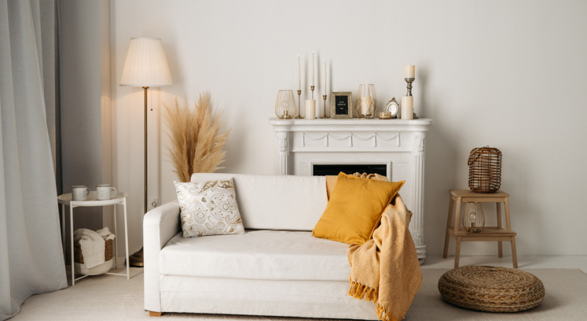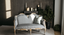 Антикварная мебель, Диван, Камин, Ковёр, Консоль, Кресло, Подушки, Пуф, Свечи, Стремянка