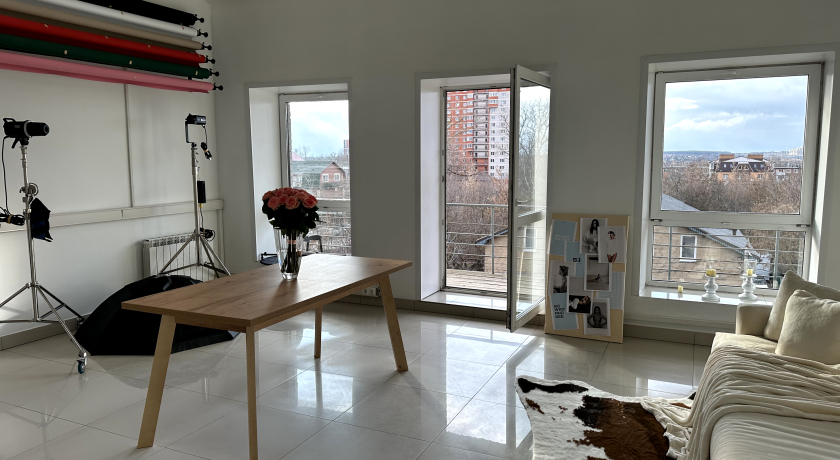 Очень уютная студия, локации можно сформировать под разные задачи. Из минусов - свет. В солнечные дни естественный свет, думаю, прекрасно ложится благодаря основным большим окнам и небольшим окнам в потолке. Искусственный свет представлен слабо, необходимо везти с собой, рассеиватель не подошел по типу крепления.